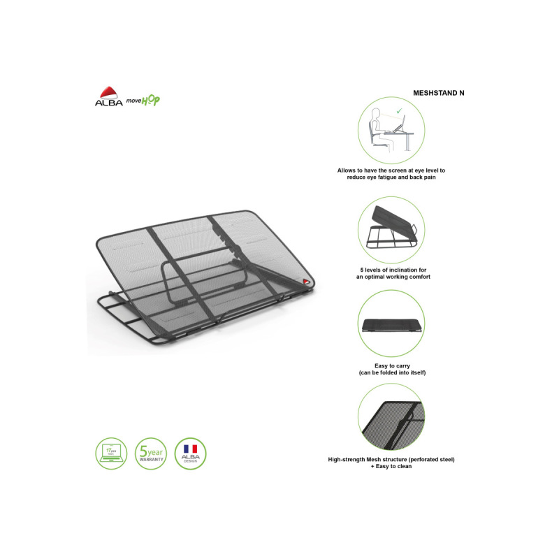 Support ergonomique pour ordinateur portable en métal Mesh. Il est muni de 5 niveaux d'inclinaison pour optimiser le confort de travail en garantissant une meilleure position du dos. L'écran au niveau des yeux aide à réduire la fatigue oculaire.