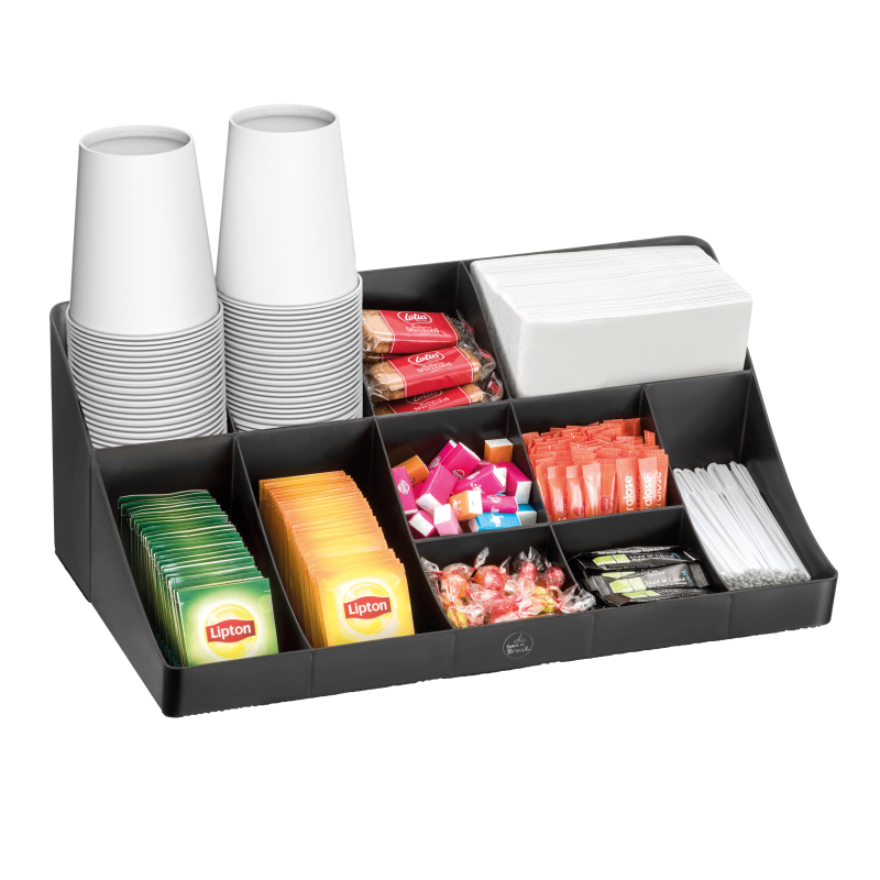 La station de rangement compartimentée "Take a Break" est dotée de 11 compartiments pour ranger serviettes, gobelets, cuillères, sachets de sucre et de thé à proximité de la cafetière et/ou de la bouilloire. Fabriquée en polystyrène résistant, elle est 100% recyclable.