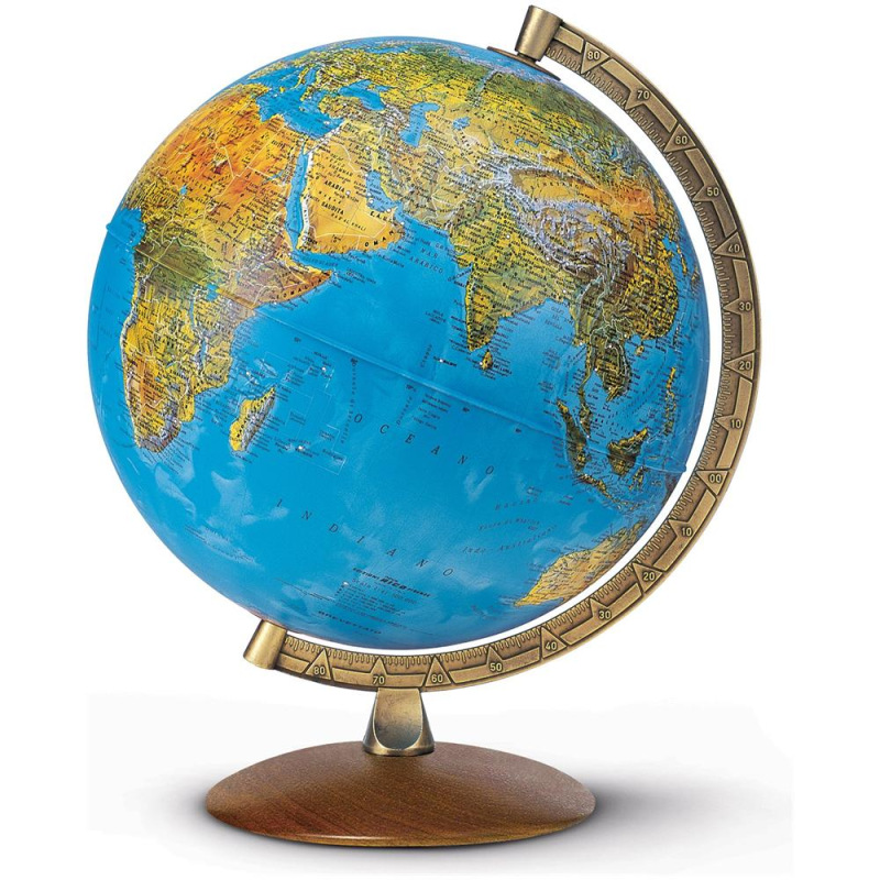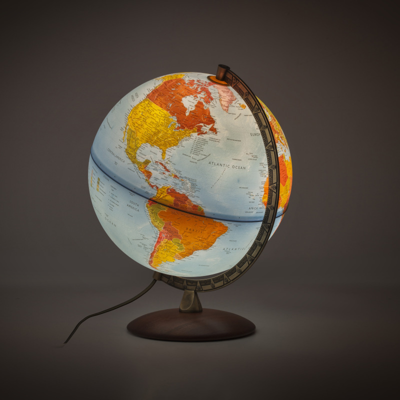 Globe géographique lumineux avec double effet : la géographie est physique quand le globe est éteint, elle devient politique lorsqu’il est allumé. Pied en vrai bois. Méridien en métal plaqué laiton chromé avec indication de la latitude en degrés.