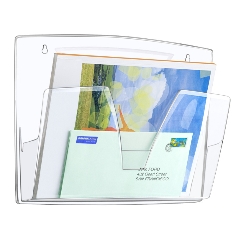 Lot de 3 corbeilles murales pour le tri du courrier ou autres documents. Elles acceptent les documents allant jusqu’au format 24 x 32 cm. Elles sont échancrées sur les côtés, pour permettre d'y insérer des enveloppes très larges A3+, tubes à dessin... Elles sont aussi munies d'une large ouverture en "V" permettant une excellente préhension des documents. Les corbeilles peuvent se fixer en grappe ou séparément (vis + chevilles fournies). polystyrène antichoc recyclable. Disponibles en plusieurs coloris.