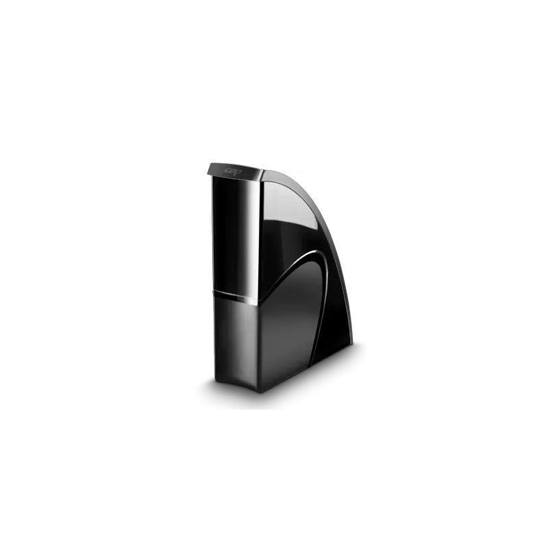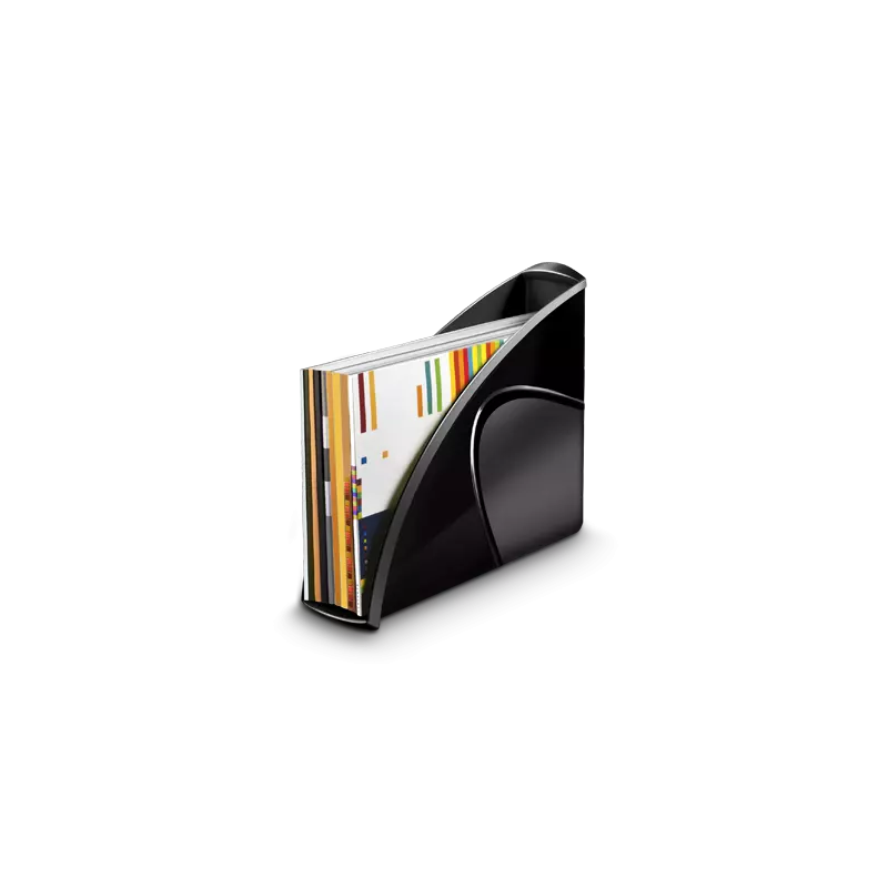 Een tijdschriftenrek met dynamische, elegante lijnen, geaccentueerd door een contrasterende matte afwerking op een glanzende achtergrond. Veelzijdig, je kunt er alle documenten tot 24 x 32 cm in opbergen, verticaal of horizontaal. Het handvat in ½ schaal zorgt voor een uitstekende grip en de drempel van 2 cm maakt het gemakkelijk om documenten op te bergen of te verwijderen. 100% gerecycled schokbestendig polystyreen. Afm. 270 x 85 H 310 mm.