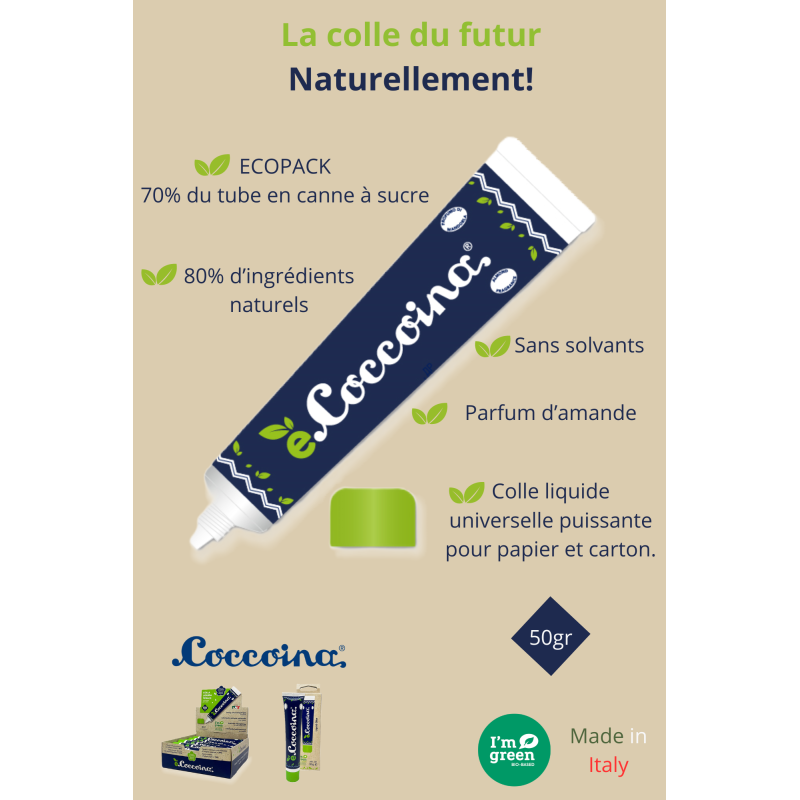 Deze lijm is helemaal ‘groen’ maar ziet er transparant uit. Volledig ecologisch: zowel de inhoud als de verpakking. Nog altijd even stevig en doeltreffend dankzij de nieuwe formule zonder oplosmiddelen op basis van polyvinylalcohol. Met de unieke amandelgeur van Coccoina.