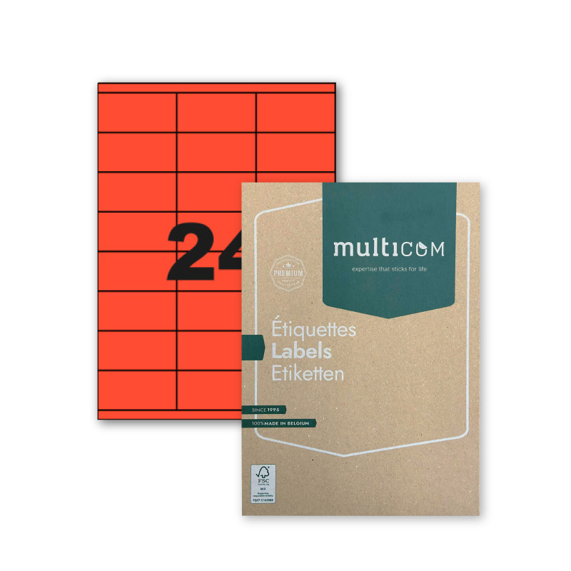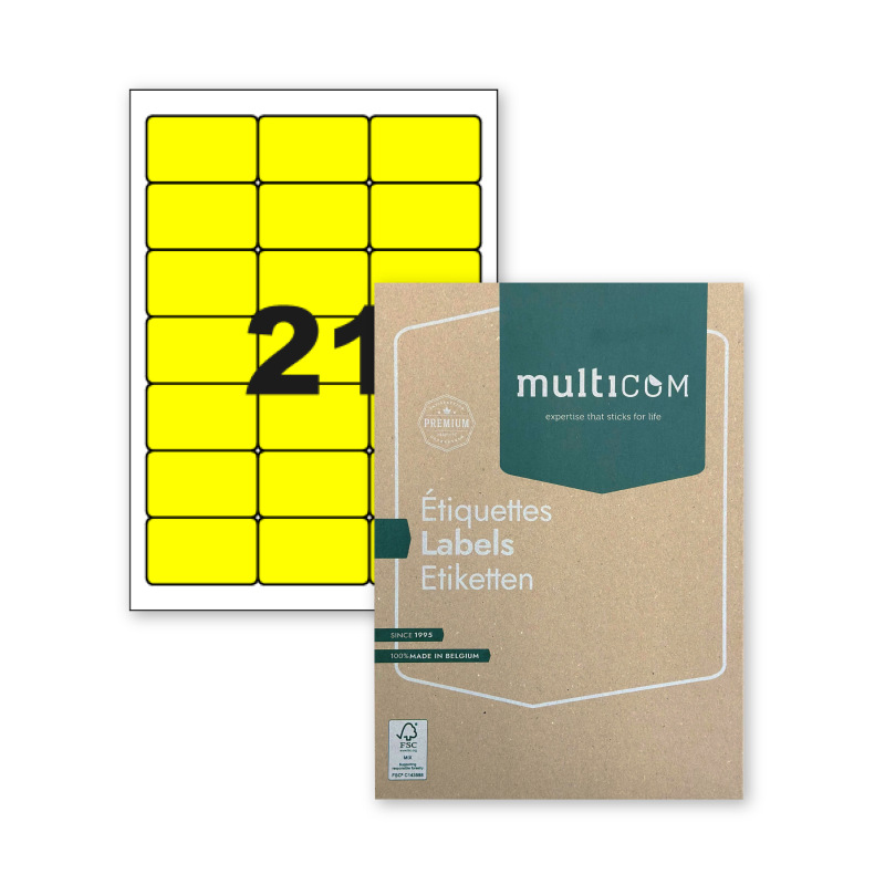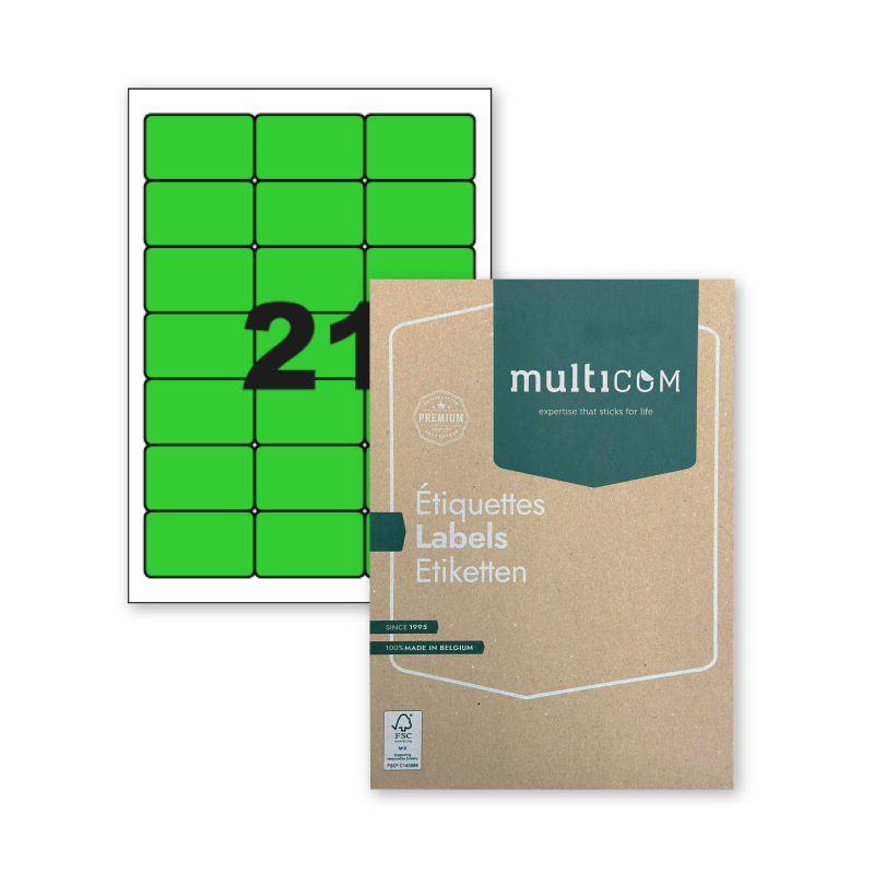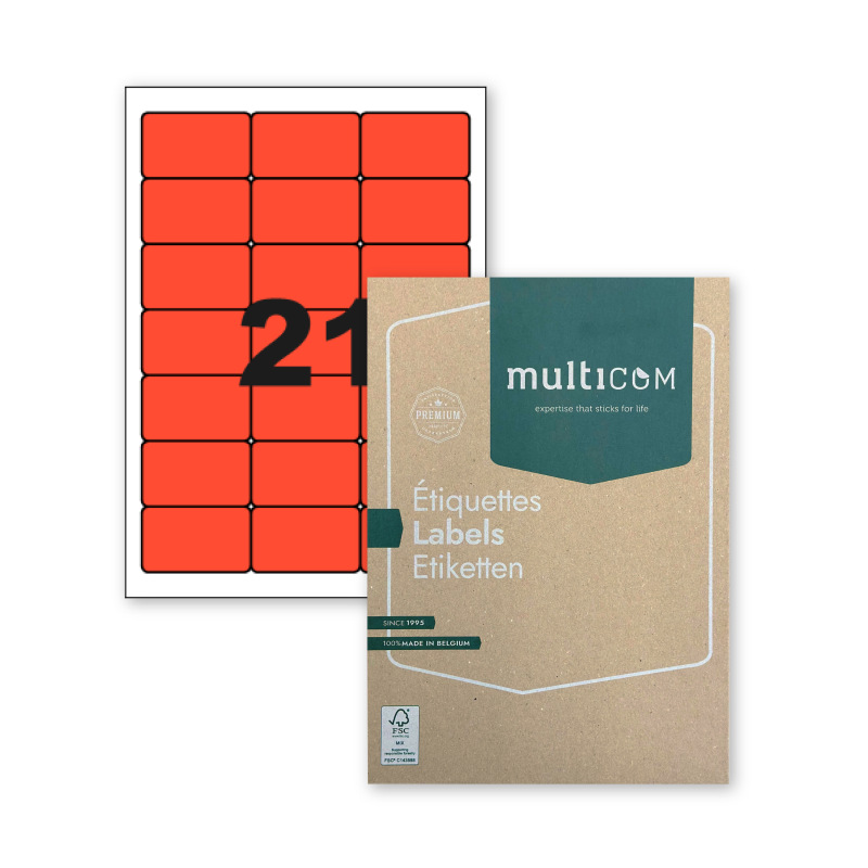 De etiketten op A4 vellen van Multicom maken je leven gemakkelijker: je kunt snel een gemakkelijk een mailing versturen, je kantoor organiseren en je schriften personaliseren. Deze etiketten zijn verkrijgbaar in verschillende vormen, kleuren, formaten en met verschillende lijmen. Bovendien zijn ze compatibel met en goedgekeurd door alle grote merken van laserprinters en kopieerapparaten. De klassieke kleuren zijn ook geschikt voor inkjet, de fluorescerende kleuren niet. Deze etiketten zijn verkrijgbaar met rechte hoeken (CL-benaming), met afgeronde hoeken (PCL-benaming), in kleine verpakkingen en in dozen van 100 en dozen van 500 vellen. Ook is er een display beschikbaar voor in je winkels. De etiketten worden geproduceerd in Brussel en verkregen in 2018 het FSC® -label. Koop duurzaam en lokaal: kies voor Multicom.