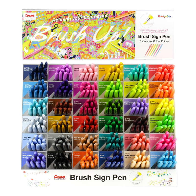 De ‘Brush Sign Pen’ van Pentel is een brushpen met een ultraflexibele, maar duurzame penseelpunt van goede kwaliteit. Je kunt er dikke en dunne lijnen mee maken, afhankelijk van de druk die op de punt wordt uitgeoefend. Hierdoor is deze brushpen ideaal voor kalligrafie, schetsen en tekenen. Zijn inkt is op waterbasis. Gemaakt van meer dan 75% gerecycleerd materiaal. Verkrijgbaar in 30 kleuren, in sets met meerdere kleuren.