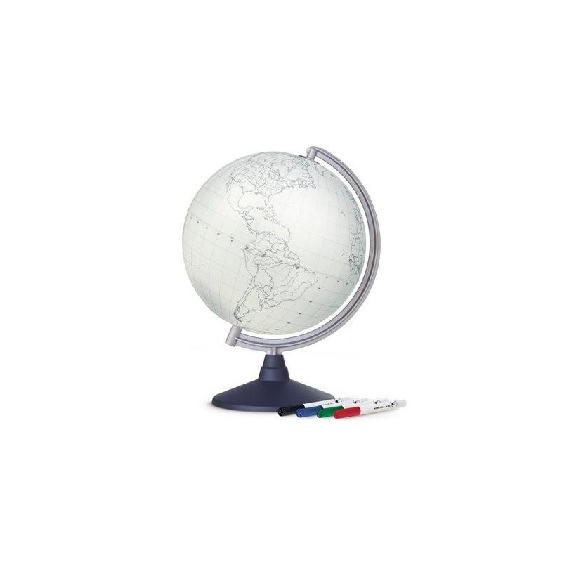 Wereldbol zonder plaatsnamen (educatief). Met de 4 gekleurde markers kunnen leerlingen de ontbrekende informatie invullen. Met een hoge, stevige voet in het blauw en een semi-meridiaan van zilverkleurige hars.