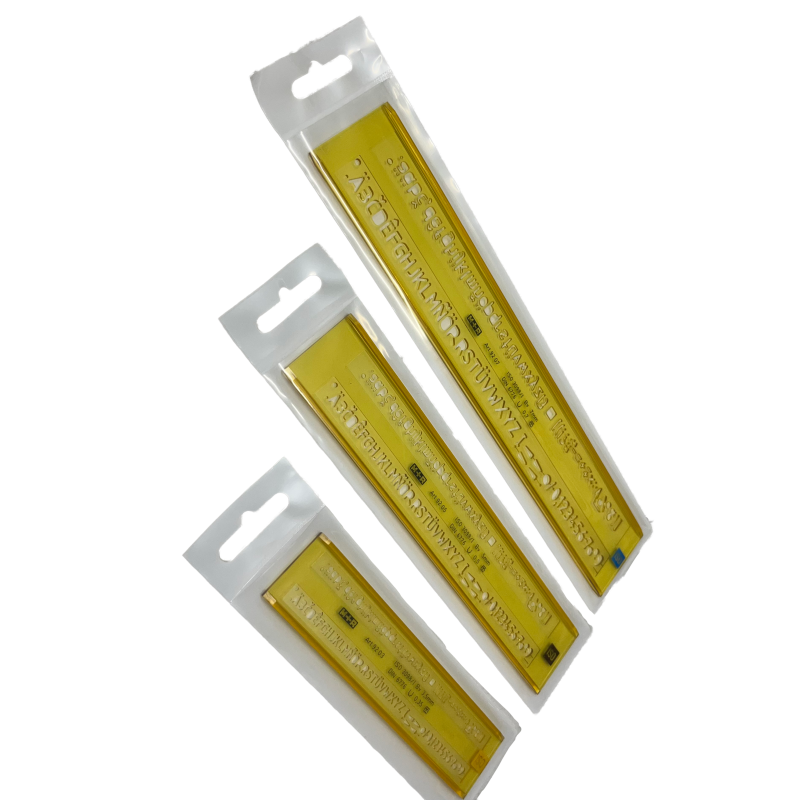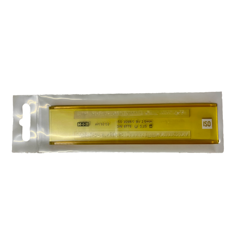 Flexibel lettersjabloon met H-profiel van M+R voor rechte letters conform ISO 3098.B. In transparant geel polycarbonaat. Beschikbare letterhoogtes: 3,5 mm,5mm en 7mm