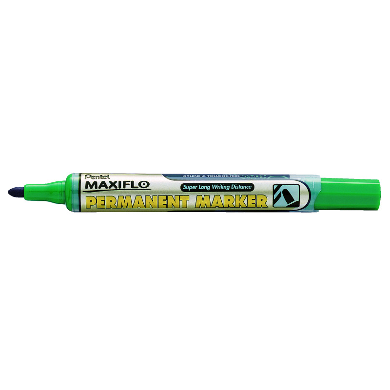 De ‘Maxiflo’ permanente marker van Pentel heeft als grootste troef dat hij nooit uitdroogt dankzij de drukknop aan de achterkant. Met die drukknop vloeit er namelijk steeds inkt in de punt. Dankzij het drukknopsysteem blijft de vloeibare inkt intens tot de laatste druppel. De marker heeft een zichtbaar inktniveau. Kan op nagenoeg elk oppervlak worden gebruikt: papier, karton, hout, kunststof, rubber, metaal, glas, gips, keramiek, polyethyleen, geëxpandeerd polystyreen, leer, enz.