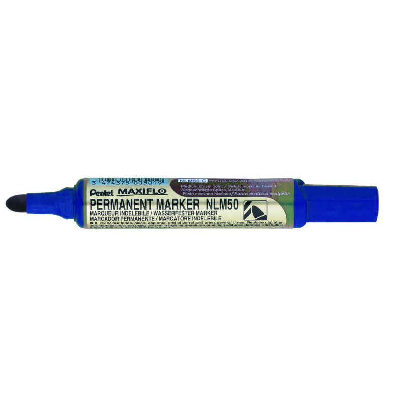 De ‘Maxiflo’ permanente marker van Pentel heeft als grootste troef dat hij nooit uitdroogt dankzij de drukknop aan de achterkant. Met die drukknop vloeit er namelijk steeds inkt in de punt. Dankzij het drukknopsysteem blijft de vloeibare inkt intens tot de laatste druppel. De marker heeft een zichtbaar inktniveau. Kan op nagenoeg elk oppervlak worden gebruikt: papier, karton, hout, kunststof, rubber, metaal, glas, gips, keramiek, polyethyleen, geëxpandeerd polystyreen, leer, enz.