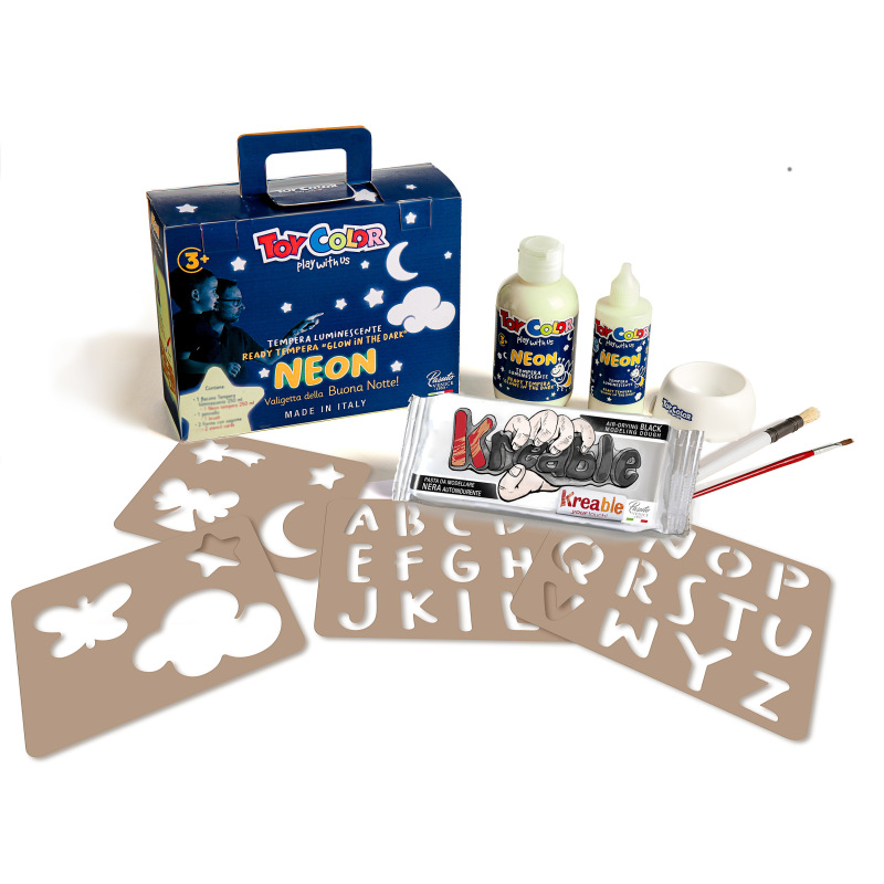 Het ‘Goedenacht’ koffertje bevat alles wat je nodig hebt om een kinderkamer mee te versieren: 4 kartonnen sjablonen, 1 fles fosforescerende plakkaatverf van 100 ml, 1 fles fosforescerende plakkaatverf van 250 ml, 1 blok zwarte klei van 500 g, 2 penselen en 1 verfpotje. Deze ‘zelfoplichtende’ plakkaatverf is fantastisch omdat ze licht vangt en langzaam weer afgeeft in het donker. Het flesje van 100 ml heeft een fijn uiteinde, perfect om de verf in de inkervingen te krijgen. De kinderen kunnen schilderen wat ze hebben geboetseerd, of een dikke laag klei maken, daar dan hun naam of iets anders in graveren en tot slot de inkervingen vullen met fosforescerende verf.