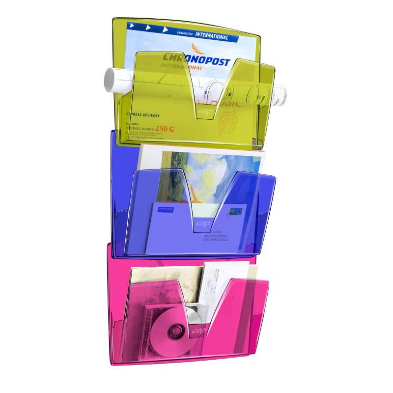 Set van 3 houders om de post of andere documenten te sorteren. Je kunt er alle documenten tot 24 x 32 cm in opbergen. Dankzij de inkepingen aan de zijkanten kun je er onder andere tekenbuizen en A3 of zelfs grotere enveloppes in opbergen. De houders hebben ook een brede V-vormige opening zodat je gemakkelijk bij je documenten kunt. Je kunt de houders uit recycleerbaar, schokbestendig polystyreen afzonderlijk of samen bevestigen (schroeven en pluggen meegeleverd). Beschikbaar in verschillende kleuren.